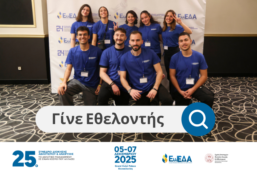 Το 25ο Συνέδριο Διοίκησης Αθλητισμού και Αναψυχής ανοίγει τις πόρτες του και σε καλεί να συμμετάσχεις ως εθελοντής, ζώντας από κοντά την οργάνωση και την υλοποίηση ενός μεγάλου επιστημονικού και επαγγελματικού γεγονότος.